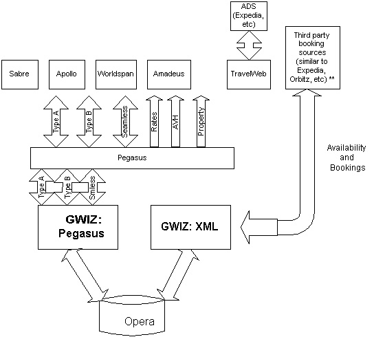 The following diagram shows how GDS/ADS and OPERA communicate through GWIZ. The top portion of the diagram shows the GDS and ADS hosts that need to be configured in OPERA as channels (Sabre, Apollo, Orbitz etc).