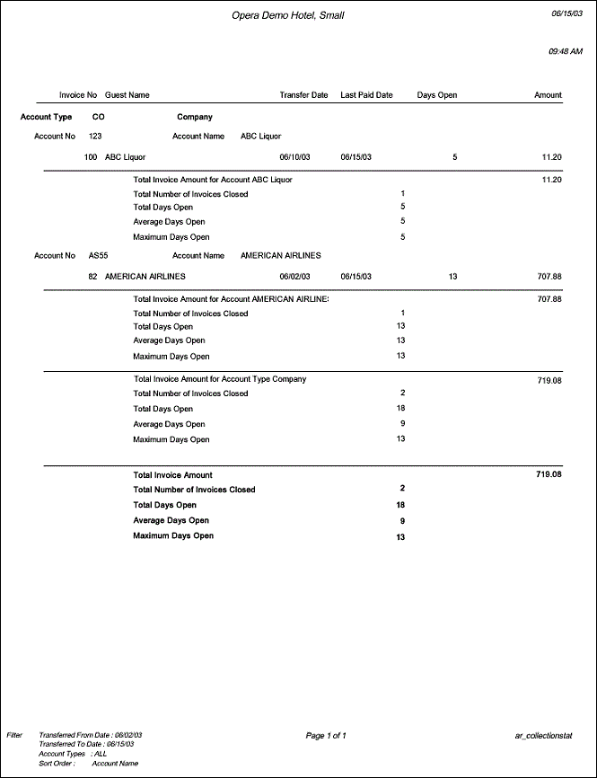 The AR Collection Statistics report will display those Accounts with Invoices paid in full, or the balance is equal to 0.00. The report calculates how many days it took to bring any Invoice balances to 0.00 from the date the record was transferred to Accounts Receivable.