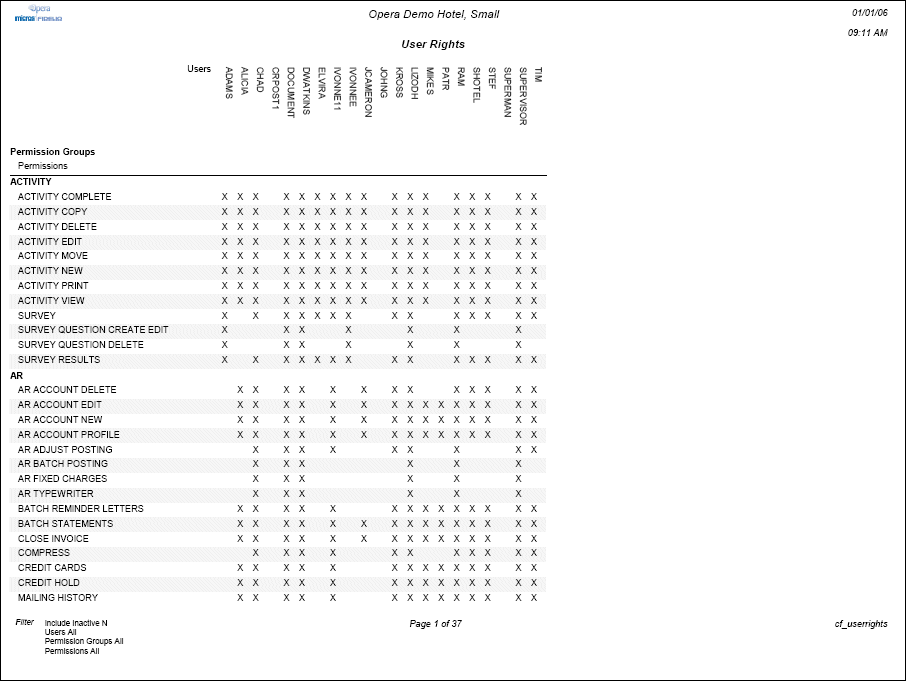 The Configuration Report for User Rights will display all users or user groups and the permissions or rights that have been configured in the application. Only user rights for product modules that are currently licensed at the property are included in the report.