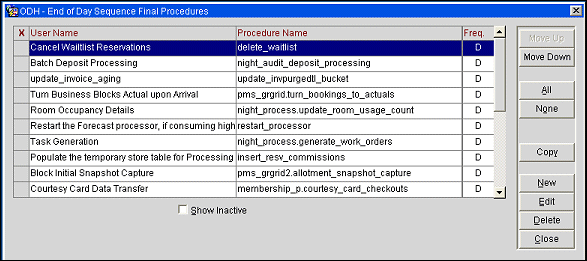 Select the Show Inactive check box to see the procedures which are currently inactive. The End of Day Sequence Final Procedures screen shows the following information.