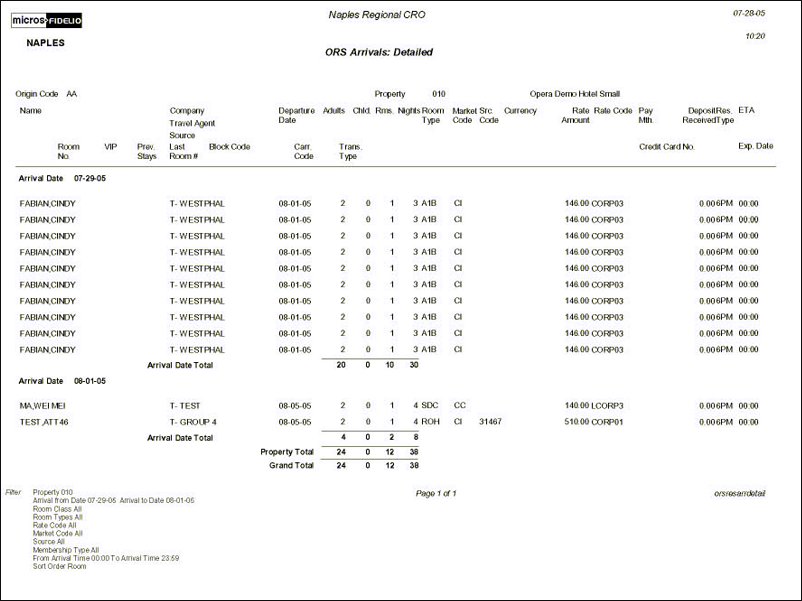 This report displays the details of guest arrivals made through ORS for the selected property. You enter the date range and other search criteria you want included in the report.