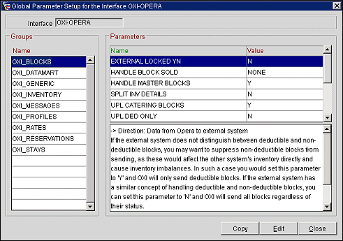 If the external system does not distinguish between deductible and non-deductible blocks, you may want to suppress non- deductible blocks from sending, as these would affect the other system’s inventory directly and cause inventory imbalances. In such a case you would set this parameter to Y and OXI_HUB will only send deductible blocks. If the external system has a similar concept of handling deductible and non- deductible blocks, you can set this parameter to N and OXI_HUB will send all blocks regardless of their status. In OPERA, the block status code determines whether a block is considered deductible. Check the OPERA block status configuration for further information.