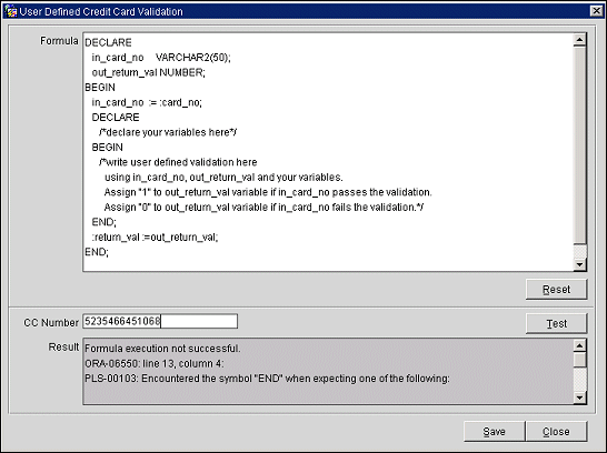 If you select User Defined as the validation rule, the Formula button becomes available. Select this button to open the User Defined Credit Card Validation window. The default validation formula for the interface credit card type selected in IFC CC Type appears. Type (or cut and paste) the appropriate code into the Formula box. To verify the code, enter a credit card number in the CC Number box and click Test. If the code verification is successful, select the Save button to save the validation formula.