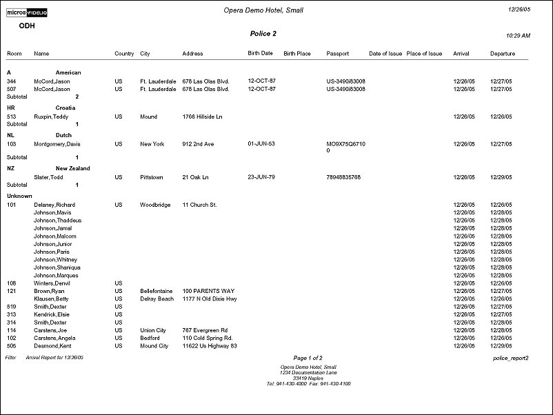 The report output is grouped by Nationality, and will display the Room number, Last Name, First Name, Country, Birth Date, Place of birth, Passport, Date of Issue, City of Issue, and Departure Date or Arrival Date.