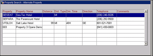 The Property Search - Alternate Property screen appears when you select the Alt. Prop tab on the Sales Screen's Properties display. The Property Search - Alternate Property screen provides a list of the properties that have been designated as alternates for the property currently highlighted on the Properties screen.