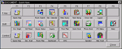 Select Miscellaneous>Show Quick Keys. OPERA's Quick Keys help you to quickly accomplish tasks you perform frequently, no matter where you are working in OPERA, without leaving the task you are currently working on. You can quickly accomplish tasks you frequently perform by using the OPERA Quick Keys template.