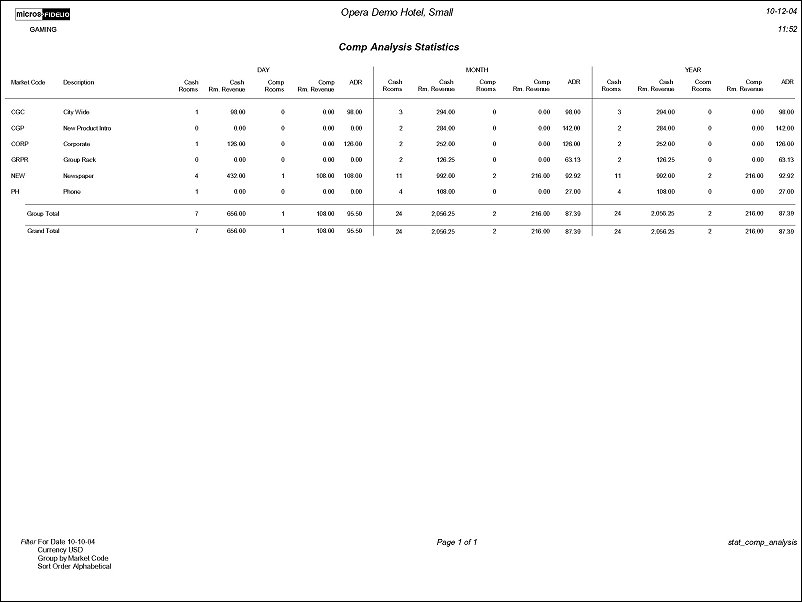 The Comp Analysis Statistics Report displays a breakdown of Cash Rooms, Cash Room Revenue, Comp Rooms, Comp Room Revenue and the Average Daily Rate (ADR). When the report is run, the report output is divided into the three sections of Day, Month to Date, and Year to Date.