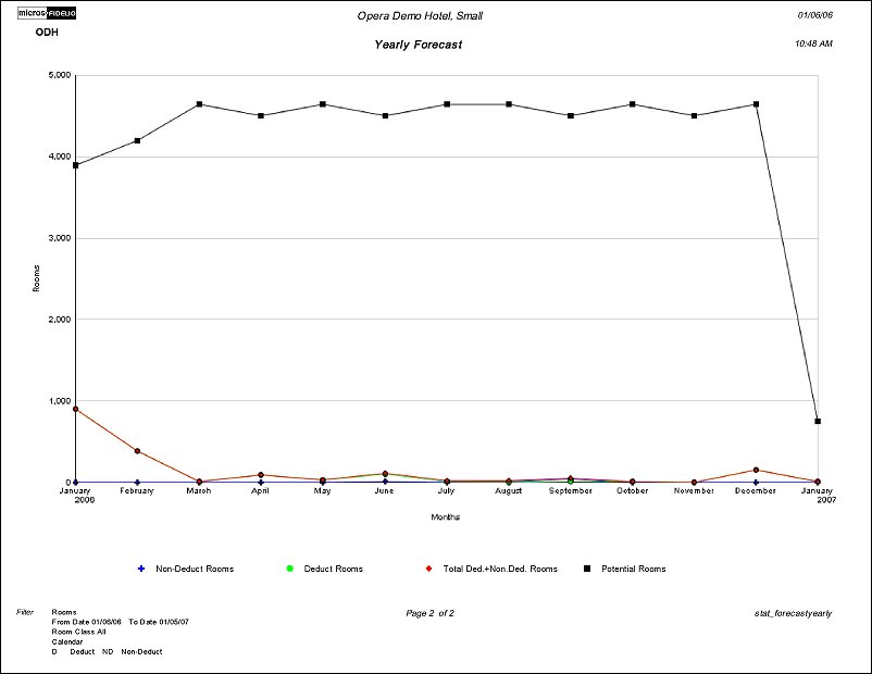 When printing the report, the last page will be a line graph to offer a visual comparison of the Non Deduct Rooms/Guest, Deduct Rooms/Guests, Total Occupied Rooms/ Total Guests, and Potential Rooms/Guests. But if running the report for Fiscal, a second query is run to gather the graph data. This second query has to be run in order to be sure that the periods are displayed in the correct order.