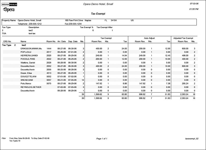 When the Cashiering > Tax Type Calculation application setting is set to Reservation, and the Cashiering > Advanced Generates application parameter is set to Y, the Tax Exempt report can be run. The Tax Exempt report gives a detailed daily breakdown of room revenue and the taxes that each specific guest is exempt from. Main areas of the report display the Tax Exempt, Auto Adjust, and Adjusted Tax Exempt data. The Tax exempt Section displays the Room Revenue for after when the guest became tax exempt, number of nights of the reservation after the guest became tax exempt, and the tax on the room revenue after the guest became tax exempt.