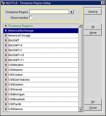 Show Inactive. Select this check box to display the inactive timezones. The inactive timezones do not appear in the list of values.